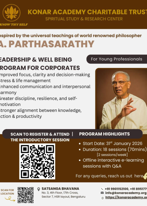 With the blessings of Swami A. Parthasarathy, Vedanta Academy, Konar Academy Charitable Trust (KACT) has been established with the vision of promoting the wisdom of balanced development of human Mind and Intellect.
